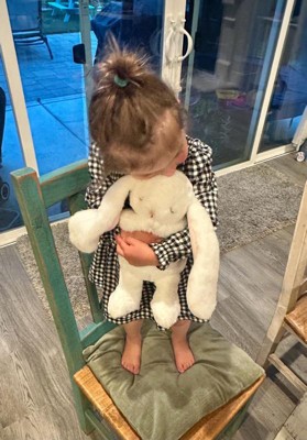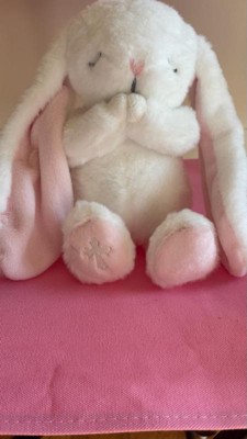 [This review was collected as part of a promotion.] This sweet bunny is so snuggly and soft. It’s a great size for a kid to snuggle with and the long floppy ears are so cute. My 2 year old immediately loved it and carried it all around the house with her. The cross detail on the foot is a nice detail.