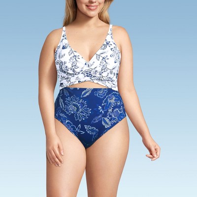 Lands' End Women's Plus Size Pique Ruffle One Piece Swimsuit - 16W - White Multi Ditsy Floral