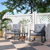 Share a snack, rock, relax and have a chat. Outsunny has a 3-piece patio furniture set that includes 2 outdoor rocking chairs and a coffee table. Made from weather-ready metal that's galvanized and powder-coated, the chairs offer a smooth sway on a fully cushioned surface. Button tufted back cushions add visual emphasis. The matte black frames feature rattan accents underneath. Including a shelf below the table, this set brings form and function to your balcony. Get out, get comfy, get Outsunny.