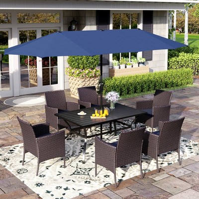 Captiva Designs 8pc Patio Wood-look Rectangle Metal Dining Table & Rattan Chairs & Navy Blue Umbrella