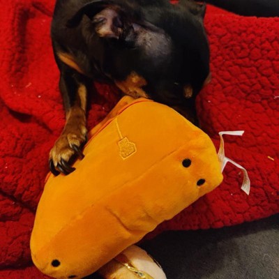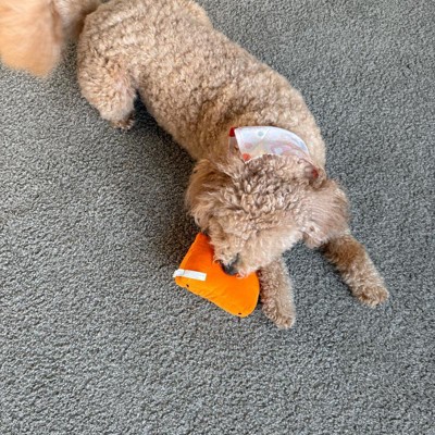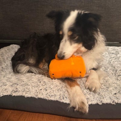 My dog is 17 years old and has never been a toy destroyer — he’s always been more of a toy lover and licker so this Barkin Bag has been perfect for him. It’s soft and gentle on his aging teeth and gums. The squeaker gives it some life but it’s a little hard to find — it surprises him anytime it squeaks. The Barkin bag is great for gentle play. And my dog uses it as a pillow — unclear if it’s because it’s soft or because he’s guarding it while he sleeps. This is a great choice for dogs looking for cuddle toys.