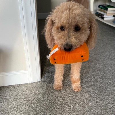 My sweet little 5 year old 30 pound mini golden doodle has been in need of some new chew toys because all of hers are completely chewed up. She’s a bit spoiled so when I saw this adorable “barkin” purse style dog toy I knew she needed it. She was very excited when I took it out of the package. She was ready to grab it and run. The only thing I didn’t love is the little white loop string on the side.