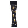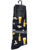 Fun and unique designed crew socks for men featuring bottles, glasses, mugs of beer and complimentary peanuts