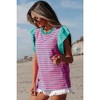 • Casual Statement Piece: A standout addition to any wardrobe, ideal for adding personality to everyday looks. striped ruffle top, casual statement tee, bold fashion, playful everyday style, relaxed fit trendy top.