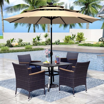 Captiva Designs 6pc Patio Slat-top Black Dining Table & Crescent Arm Rattan Chairs & Market Umbrella
