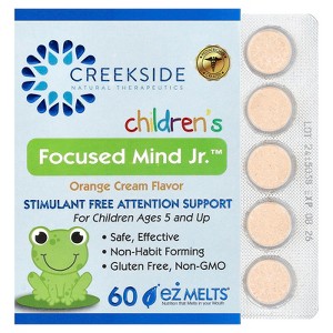 Creekside Naturals Focused Mind Jr supports focus, memory and attention with clinically proven ingredients including Inositol, DMAE and Phosphatidylserine. The pediatrician-formulated Orange Cream EZ-Melts formula contains zero sugar and helps maintain cognitive function in children ages 5 and up.
