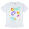 Adorable Crossover Design: Celebrate two beloved worlds in one! This women’s t-shirt features Kuromi from Hello Kitty and Harmony Bear from Care Bears floating together with a colorful balloon, creating a playful and dreamy aesthetic