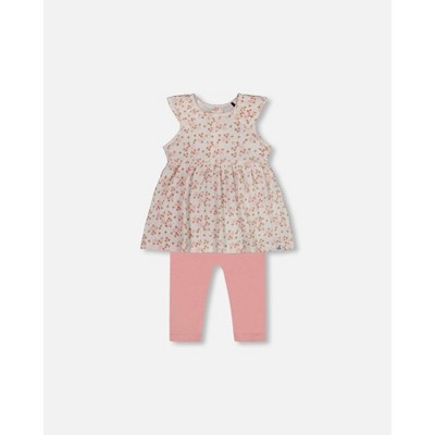 Deux par Deux Girl Printed Organic Cotton Tunic and Leggings Set White with Pink Flowers - 3 Months