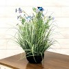 The Potted Blue Cosmos with Onion Grass & Butterflies adds a lively touch to spring and summer decor. Standing 20 inches tall, this faux plant features green plastic branches, blue berries, and dimensional blue flowers for a full, eye-catching display. Three colorful butterfly accents are attached with small springs, allowing for gentle movement. Housed in a black bowl-style pot with a brown substrate base, this arrangement is easy to display on tables, shelves, or entryways. With its bright colors and realistic design, this potted plant is a simple way to refresh any space.