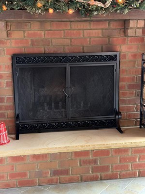 Cast iron scrollwork gives this screen presence. Enjoy the dancing flames of your hearth framed by our exclusive fire screen with cast iron scroll border. The sturdy steel frame ensures durability, while the unique cast iron detail exudes elegance. Dual-door front allows easy fire tending. Classic black finish works with any style hearth. Screen includes two back legs that can change position along the bottom (simply slide and tighten).