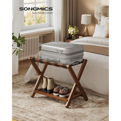 This solid wood luggage rack offers a sturdy and stylish solution for organizing your suitcases, bags, and travel essentials. Designed for instant use with no assembly required, it features a foldable frame for easy storage when not in use. The built-in shelf provides extra space for shoes, books, or accessories, keeping your belongings neatly arranged. Crafted from high-quality natural wood, this luggage holder ensures durability and elegance, making it a perfect addition to any bedroom, closet, or entryway. Its space-saving design maximizes functionality without compromising on aesthetics. Overall Size: 26.4"L x 16.6"W x 22"H (67 x 42.2 x 54.7 cm) Folded Size: 26.4"L x 3.2"W x 24.4"H (67 x 8 x 64 cm) Product Weight per Rack: 7.9 lb (3.6 kg) Max. Static Load Capacity of the Top: 150 lb (68 kg) Max. Static Load Capacity of the Lower Shelf: 50 lb (22.7 kg) Max. Total Static Load Capacity per Rack: 200 lb (90.7 kg)