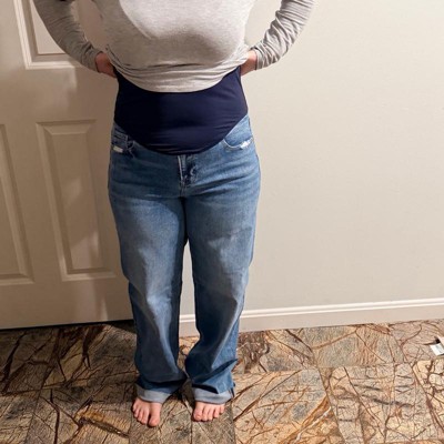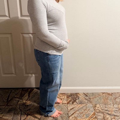 These are the PinkBlush blue vintage wash raw hem wide leg maternity jeans. I got these in a size 29 for my sister. These are super stylish and very comfortable. She normally wears a 28 in jeans so we sized up one size to accommodate her growing belly. They were a bit long, she is 5’2” but we gave them a roll up at the hem and they will be perfect with shoes. The jean material is soft and stretchy. The tummy panel is soft to the skin and has a lot of stretch but still supports the belly. These are very trendy with the wide legs and they are super comfortable around her belly right now and she feels she will be able to wear them for her last 3 months and they will still be very comfortable.