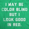 Sarcastic Statement Design: Mens funny graphic tee featuring the phrase “I May Be Color Blind But I Look Good in Red,” designed for bold personalities who enjoy dry humor, clever sarcasm, and eye catching text based graphic shirts.