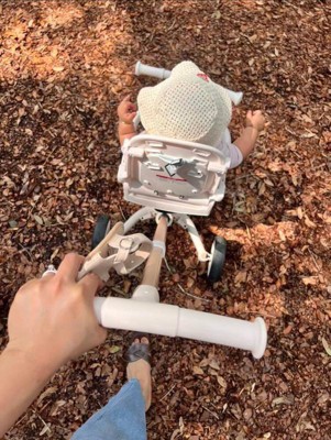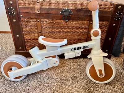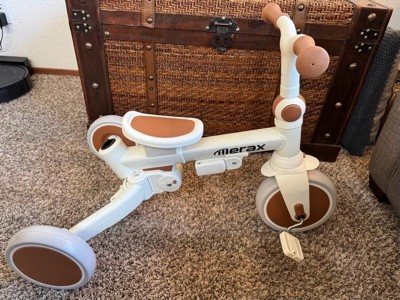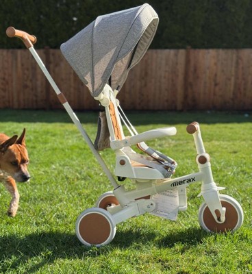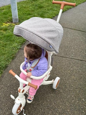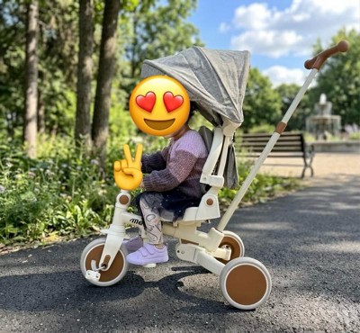 [This review was collected as part of a promotion.] We had so much fun with this! It was extremely easy to assemble and transition from balance bike, to tricycle, to stroller using the buttons. The stroller has a safety harness to secure them in. It also has a sunshade, support bar, foot rests and a pocket in the back for storage. The support bar and foot rests fold in for when the child is old enough to reach the handle bar and pedals. The large seat with back rest can be used while learning to ride the trike. The stroller steering was a little awkward and took a minute to adjust to. It controls the front wheel and handle bars so the steering was a little sharp. The stroller was simple to fold up and throw in the back of the car. It can easily be disassembled further than the picture I included if you have less trunk space. At only 13lbs it is lightweight and feels well made and durable. Overall I really love this thing. It’s nearly perfect with the only place for improvement being the steering in stroller mode. I was used to it by the time we got around the block and we were zooming around doing wheelies but I don’t think I would want to push it around the zoo for an all day trip. I especially love that I don’t have to buy several different bikes and trikes or store them around my house while she is growing so fast. I know we will be getting a lot of use out of this for years and definitely recommend buying.