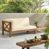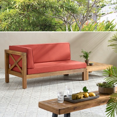 GDFStudio Keith Outdoor Acacia Wood Left Arm Loveseat and Coffee Table Set with Cushion, Beige/Teak