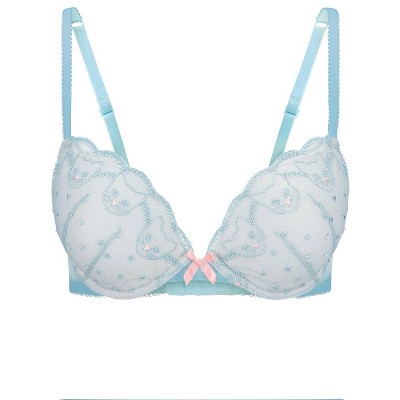Push-up bras are back! This push-up bra has a plunging neckline, cute embroidered cat motifs along the cups and panties, and adjustable back straps.