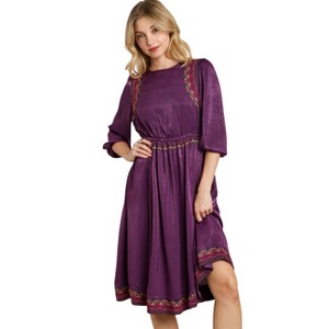 Slickblue Purple Satin Round Neck Embroidery Midi Dress - Flattering Balloon Sleeves, Size S-L - 2 of 4Slickblue Purple Satin Round Neck Embroidery Midi Dress - Flattering Balloon Sleeves, Size S-L - 3 of 4Slickblue Purple Satin Round Neck Embroidery Midi Dress - Flattering Balloon Sleeves, Size S-L - 4 of 4