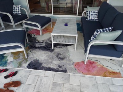 CARE: For an outdoor rug, remove debris frequently with the use of a broom or blower. To wash, spray the surface with a soap and water mixture, then rinse thoroughly with a garden hose and hang over a railing to dry thoroughly. Rotate for even wear.