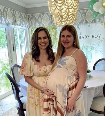 I’m 7 months pregnant and bought this to wear to my baby shower in a few weeks. Pre-pregnancy, I was a small. I bought a medium to accommodate the bump and my chest/hips that have also gotten bigger. It fits really well, and the empire waist works really well for the bump (the stitching sits above it and not on it).