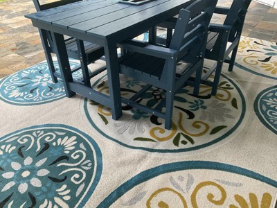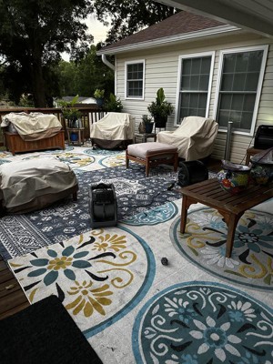 CARE: For an outdoor rug, remove debris frequently with the use of a broom or blower. To wash, spray the surface with a soap and water mixture, then rinse thoroughly with a garden hose and hang over a railing to dry thoroughly. Rotate for even wear.