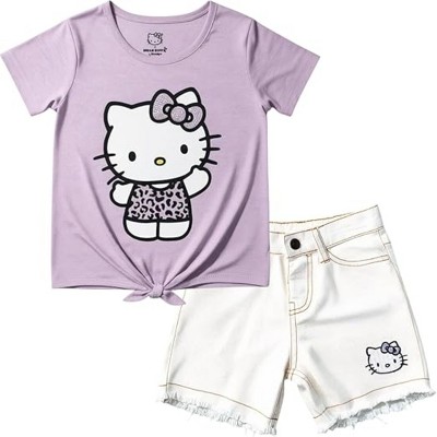 - Contains one red short sleeve T-shirt with the iconic Hello Kitty and her signature bow print, paired with grey shorts covered in an allover Hello Kitty print for a playful, eye-catching look. Available in girl clothes sizes 4, 5, 6, 7, 8, 10, and 12.