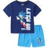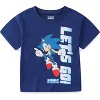 - Contains a navy blue short sleeve tee with a bold Let’s Go print and an action packed Sonic the Hedgehog graphic, paired with blue shorts showcasing a dynamic print.
