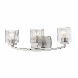 A master or guest bath moves from functional to fashionable with this brushed nickel finish two-light vanity light. Chiseled clear glass shades deliver intriguing texture to a charming contoured steel frame. Bathroom/Powder Room Mounting Direction: Up/Down Shade Included: Yes Dimmable: Yes Material: Steel, Finish Color: Brushed Nickel, Width: 24", Height: 7.75", Length: 5.5", Depth: 5.5", Backplate Width: 5", Backplate Length: 8", Lamping Type: Incandescent, Number Of Bulbs: 3, Wattage: 100 Watts, Dimmable: Yes, Moisture Rating: Damp Rated