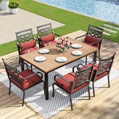 Captiva Designs 5pc Patio C-shaped Cross Bracket Rectangle Steel Bar Table & Red High Bar Stools