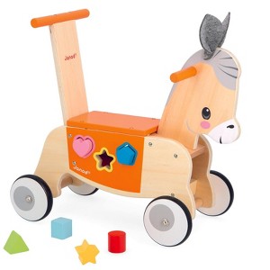 Little donkey can't wait to discover the world, and neither can baby! With this wooden donkey carrier, you're on your way to new adventures, from 12 months. Come on, hu! By riding his carrier, baby develops his sense of balance and gross motor skills, while discovering his environment. Want to push your toy or be pushed? Thanks to the handle on the back! Whichever way your little one uses his carrier, he'll learn to manage his weight and have a great time. The little extra for this early-learning toy? The shape box included, with 6 shapes to insert and retrieve from the front, so you can start all over again. Perfect for practicing dexterity! Last but not least, the 4 rubber wheels are quiet and provide a good grip, so you can walk around in complete peace of mind. Ideal for encouraging gross motor skills and strengthening support for walking, this wooden carrier is a real eye-catcher, with its little felt ears and soft colors. Whether your little one loves farm animals or simply trotting, he'll be delighted! This early-learning toy is made from FSC™-certified wood from sustainably managed forests. A companion to ride or push. Shape box included, for even more fun. Ideal for developing baby's motor skills, from 12 months