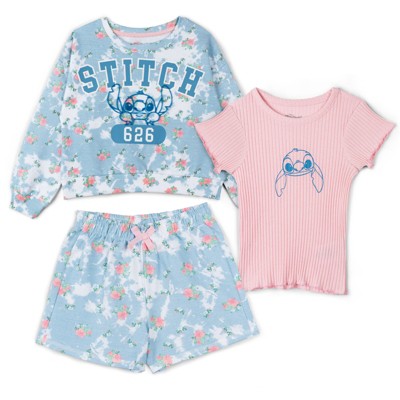 Disney Lilo & Stitch Toddler Girls French Terry Drop Shoulder Pullover Sweatshirt, T-Shirt and Shorts 3 Piece Outfit Set Tie Dye Blue / Pink 4T