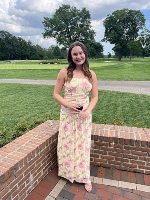 Such the perfect summer wedding dress. It was way more yellow in person than the pictures online. Extremely comfortable and the fabric is nice and stretchy! If I knew it was so stretchy I would have sized down but it still worked.
