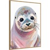 The artwork features a close-up of a seal with expressive eyes and a gentle expression. Its fur is depicted in a blend of pastel colors, giving it a soft and inviting appearance. Bold brush strokes add texture and create an impressionistic feel. This canvas art print was created by Ohkimiko and printed in Waunakee, WI. It is stretched across a solid surface to resist sagging. We use only premium, high-tension canvas. Our exclusive stretching techniques hide corner folds and provide a taut canvas surface. The artwork is authentically licensed. The canvas appears as if it is floating in the frame because it has a narrow gap between the edge of the canvas and the frame. Our canvas items are individually made using traditional custom framing techniques, it has the quality you would expect from your local frame shop.