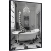 The artwork depicts a giraffe comfortably lounging in a clawfoot tub filled with bubbles, set in an elegant bathroom with a grand chandelier overhead. The floor is made of patterned marble tiles, enhancing the room's sophistication. The scene combines elements of fantasy and humor with a striking monochrome color palette. This canvas art print was created by Niky Rahner and printed in Waunakee, WI. It is stretched across a solid surface to resist sagging. We use only premium, high-tension canvas. Our exclusive stretching techniques hide corner folds and provide a taut canvas surface. The artwork is authentically licensed. The canvas appears as if it is floating in the frame because it has a narrow gap between the edge of the canvas and the frame. Our canvas items are individually made using traditional custom framing techniques, it has the quality you would expect from your local frame shop.