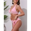 Feature: Two pieces, link with O-ring seashell pendants decoration on the front, ribbed fabric, lace-up halter bikini triangle top, removable padded cups, high-cut triangle bottom with tie decoration