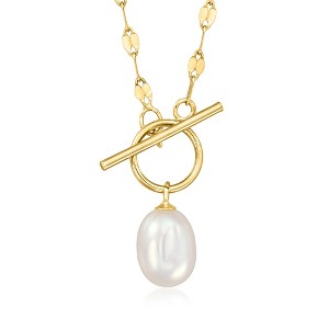 Define your style with stack-and-layer essentials from our Pure Collection. Create the perfect look to show off your personality. Simple yet elegant, our 14kt yellow gold lumachina-chain necklace features a toggle clasp, made to be flaunted with a lovely 6-6.5mm oval cultured freshwater pearl drop. White pearl toggle necklace. Necklace drop length - 5/8 inch long. Necklace drop width - 1/4 inch wide. Pearl InformationPearl Type 1: Freshwater-CulturedPearl Minimum Color 1: Freshwater-CulturedPearl Lustre 1: Medium-LusterPearl Shape 1: OvalPearl Uniformity 1: GoodPearl Surface Blemishes 1: Moderately BlemishedPearl Stringing Method 1: Moderately BlemishedSize Per Pearl 1: 6-6.5mmNumber Of Pearls 1: 1