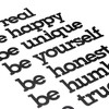 Design: A set of eight individual pieces featuring motivational words like "Be," "Real," "Yourself," "Unique," "True," "Honest," "Humble," and "Happy."