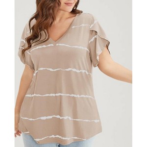 Plus Size Tops for Women V Neck Tops Stripes T-Shirt with Flutter Short Sleeve Plus Size Summer A Line Flowy Casual Tops,Khaki - XL