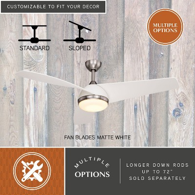 The white on white finish, hand carved solid wood blades, and clean lines give the Curtiss ceiling fan its on-trend contemporary look. This fan is compatible with sloped ceilings and includes a 6 inch downrod (longer down rods sold separately). Exterior damp rated, ideal for indoor or outdoor spaces such as entryway, family room, bedroom, bathroom, living room, kitchen, or covered outdoor porches. Remote control included for Live convenience. An integrated LED light kit provides energy savings, low maintenance and long-lasting performance.