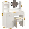 This vanity set features a sturdy MDF build, a tri-color LED mirror with touch controls, and multiple drawers and shelves for organized storage. Its elegant design makes it a perfect gift, and easy assembly ensures quick setup.