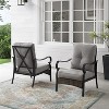 Featuring lovely, curved arms and a classic x-back design, the Dahlia Patio Chairs (Set of 2) have a unique traditional charm. Constructed of powder-coated steel, these chairs offer deep cushioned seats covered in spun polyester. To complete the look, the each outdoor chair has a resin wicker accent along the base, allowing this patio set to blend with a variety of outdoor settings.