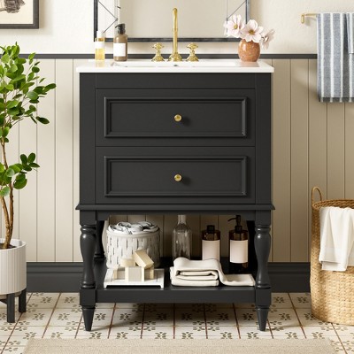 Upgrade your bathroom with this stylish 24" vanity, designed for both elegance and functionality. Featuring a sleek ceramic sink that’s easy to clean and resistant to water stains, it adds modern flair while ensuring everyday convenience. The vanity includes a spacious cabinet with a 2-tier pull-out basket and a deep drawer, providing smart, organized storage for all your bathroom essentials. Soft-close doors and smooth-glide drawers enhance user experience, while the open-back design simplifies plumbing installation. Perfect for compact spaces, this vanity offers both beauty and practicality in one compact footprint.