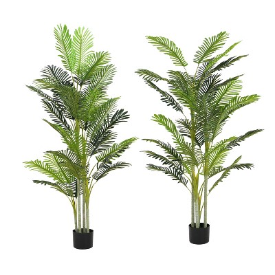 Add a touch of the tropics to your home with this set of two indoor artificial palm trees. Each tree features lush, feathered green fronds and a realistic, unbranched stem for a natural look. Pre-potted for easy placement, they’re perfect for enhancing any room—just drop into your favorite decorative planter. Made with durable materials, these low-maintenance palms require no watering or sunlight. Instantly elevate your space with vibrant greenery and island-inspired charm, all without the upkeep of real plants.