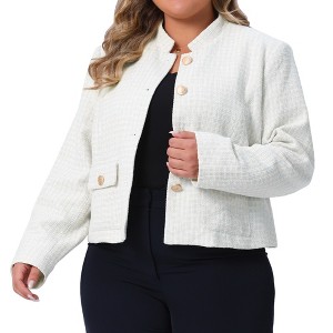This is a stylish cropped tweed blazer with a plaid pattern, long sleeves, two flap pockets, button closure, fully lined, with padded shoulders