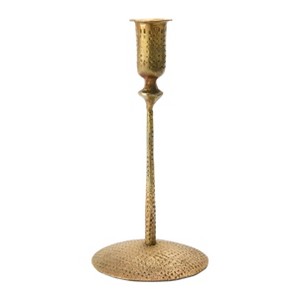 Add some flair and charm to the space with this antique brass hammered metal taper holder. It is made of durable metal with a hand-forged hammered texture that adds some character and dimension to the piece. It has an antique brass finish that gives it a rich and elegant look. It can hold any standard wax or LED taper candle, creating a cozy and romantic ambiance in the home. Place it in any room, such as the living room, dining room, or bedroom, and create a stunning focal point. Also, mix and match it with other candle holders of different shapes and sizes for a more eclectic and dynamic look. This taper holder is a versatile piece that can suit any home decor style, from traditional and elegant to industrial and chic. It is easy to clean and maintain; wipe it with a dry cloth. It measures 4 inches in diameter and 8.75 inches in height. This antique brass hammered metal taper holder is a must-have for home.
