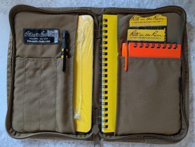 My beige Side Bound C980 Book Cover holds a No 373 yellow, side spiral Universal notebook in the back left side pouch (it is placed spiral end to the left to decrease bulk). On the left side front inner area are four pen slots. A yellow YE13 Mechanical Clicker Pencil is in the fourth slot from the left (again to avoid bulk) leaving three pen slots free. In the back right pouch is a yellow No 1773 Outdoor Journal (Universal pattern), placed with spiral to the left of the book cover. The front inside right pouch holds a No OR35 Orange Top Spiral Notebook (Universal pattern), and an orange No 97 All-Weather Metal Pen (clicker style, pressurized ink cartridge). The pen is to the left of the notebook (reduces bulk by being offset from the pencil on the other side). With the three different notebooks I can record and separate personal and business data. Using both the pencil and pen give me options to highlight various facts. This is a functional, water resistant set-up that uses minimal space.