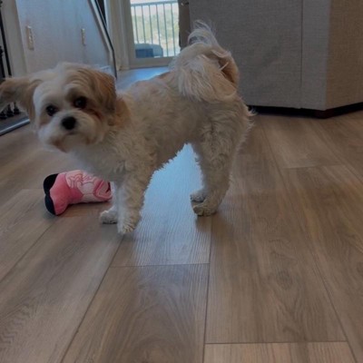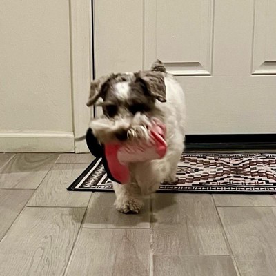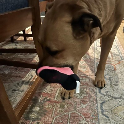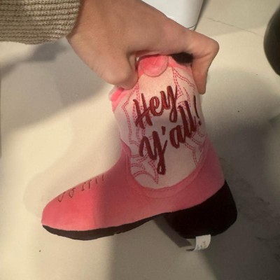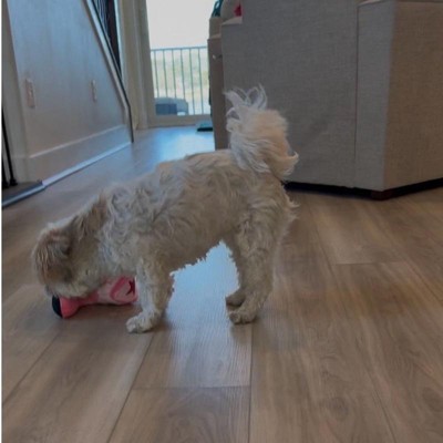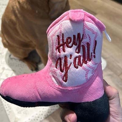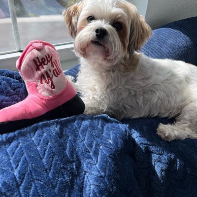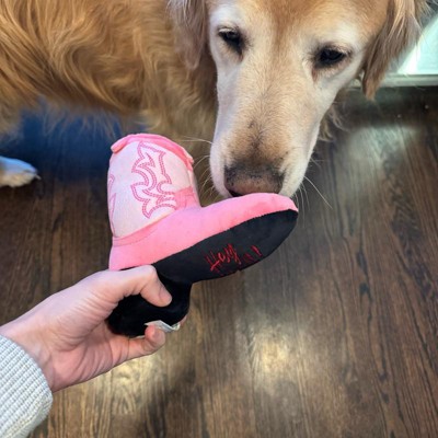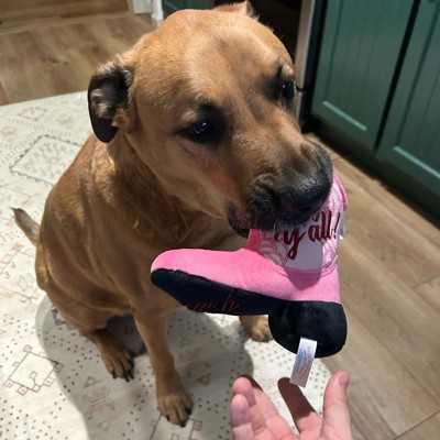 I was super excited to give my 13 pound country diva shorkie girl a country boot. Unfortunately it was just a little too much boot for my girl. She seemed to have a hard time getting her mouth around the boot and just got frustrated. This seems like a really nice quality toy with two squeakers, but I think it’s probably suited for a larger or even a more toy aggressive dog.