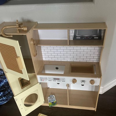 Costway Wooden Kids Play Corner Kitchen with Realistic Lights & Sounds Lighted Range Hood Brown/Grey