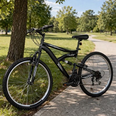 Conquer trails with the Hykolity 26/27.5-Inch Shocker Dual Suspension Mountain Bike, designed for adult riders (5'2" and up) seeking adventure. Perfect for men, women, and teens aged 13+, this durable steel-frame bike offers a smooth, comfortable ride on rugged trails, dirt paths, or pavement. With 18-speed twist shifters, full suspension, and responsive linear-pull brakes, it’s built for versatility and control.