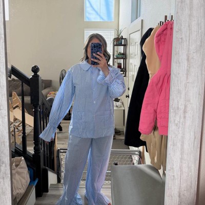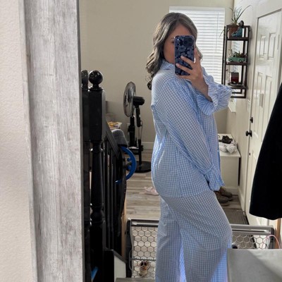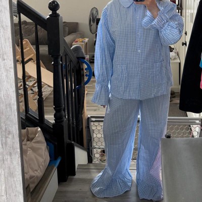 Anna-Kaci Lounge Women's Gingham Button Down Pajama Set with Long Sleeve Collared Top and Ruffle Hem Wide Leg Pants - Small, Blue