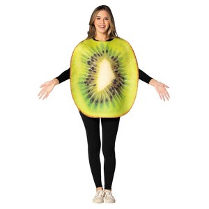 Adult green kiwi fruit tunic costume featuring a photorealistic print of the inside of a kiwi, made of 100% polyester foam, one size fits most adults up to 205 lbs. Care Instructions: Hand wash cold water with mild soap. Tumble dry low. For best results hang or lay flat to dry.